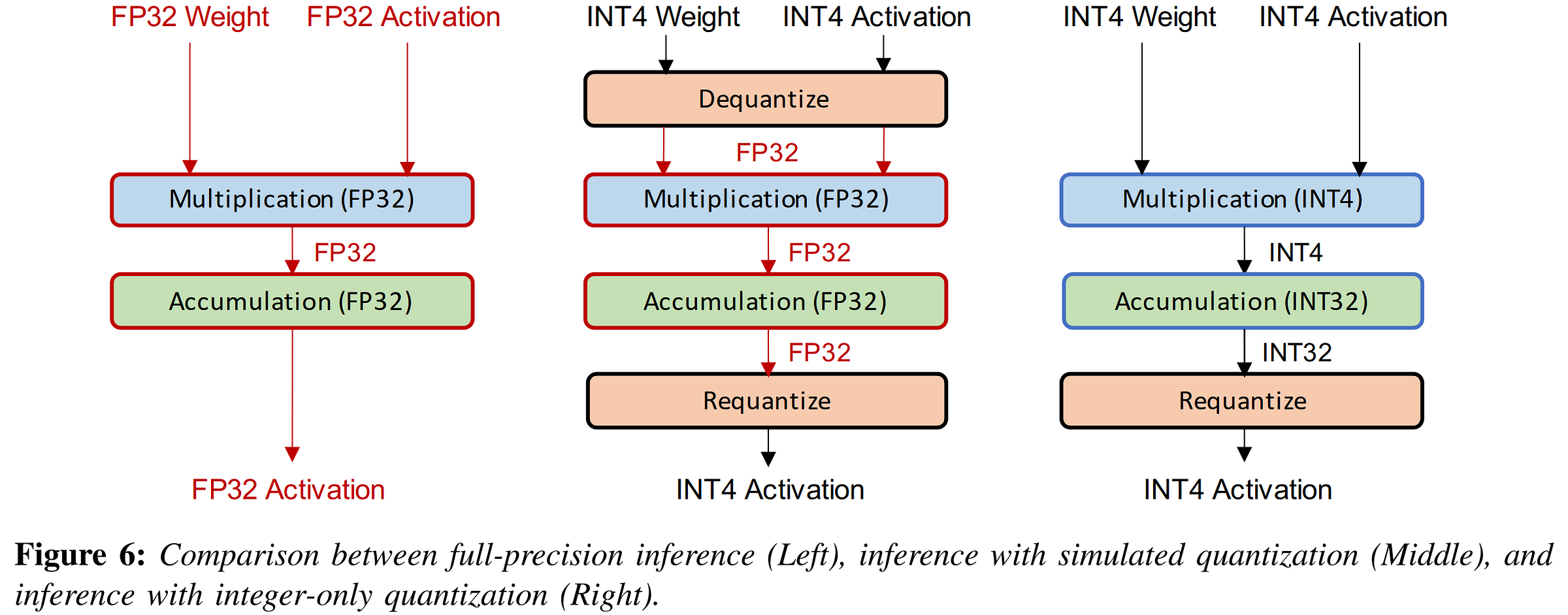 Figure from Gholami et al. 2021 survey shows the distinction between full-precision, simulated quantization, and integer-only quantization.
