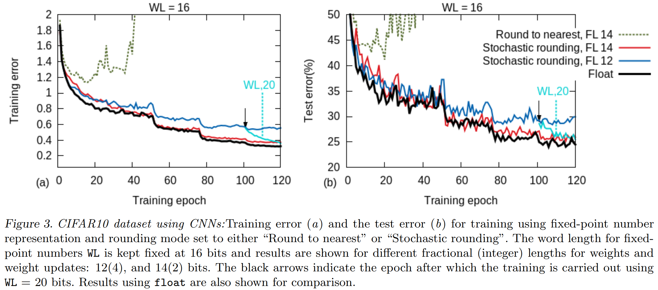 Results from Gupta et al. 2015 show the power of stochastic rounding, as the 16bit fixed-point training with 14 bits allocated to the fractional length (FL) nearly matches the floating-point training curve, while the same fixed-point arithmetic using “Round to Nearest” caused training to diverge.