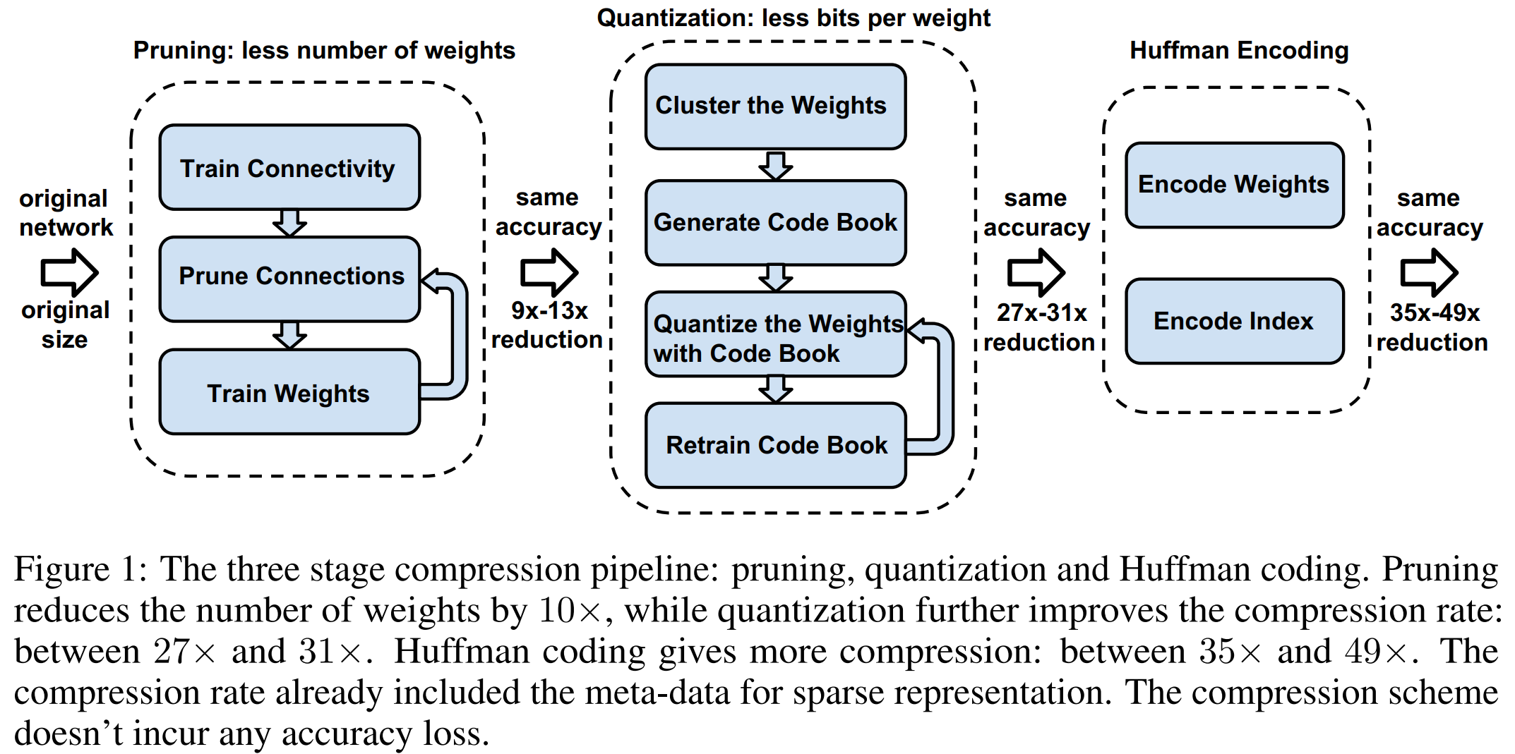 Flowchart from “Deep Compression” illustrates their three stage compression technique.