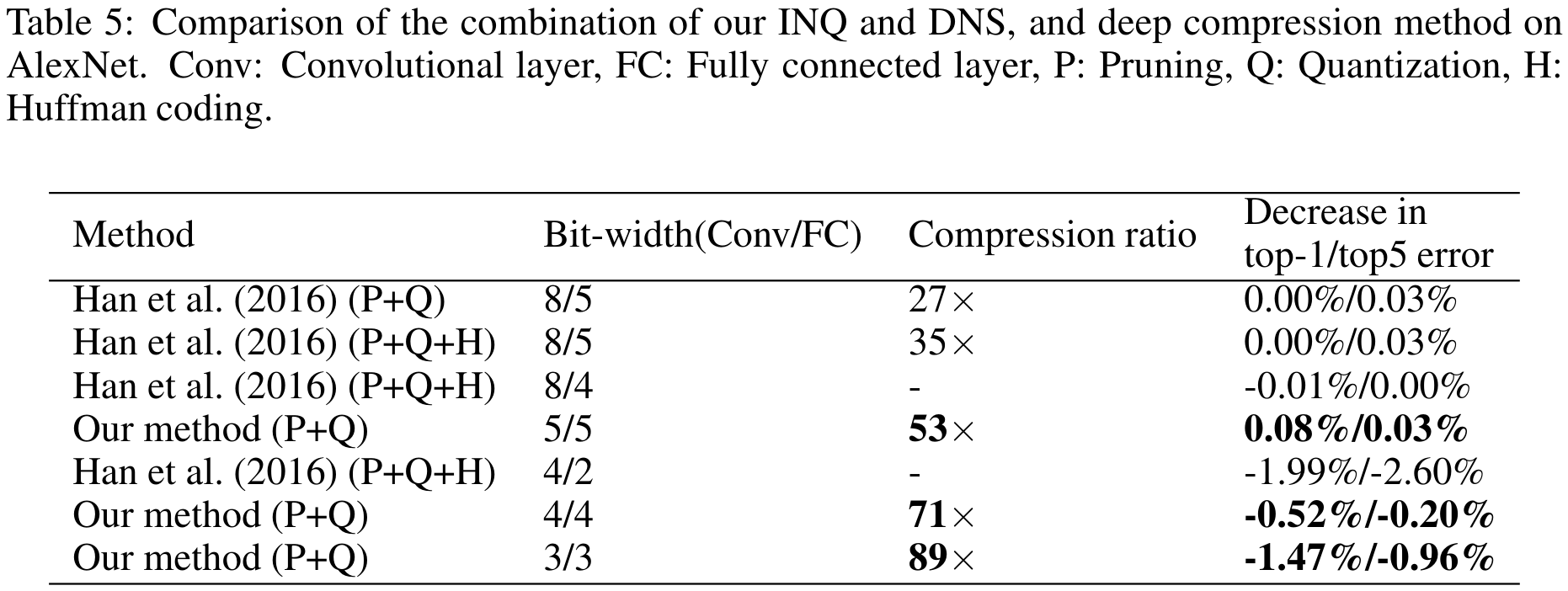 Han et al.’s 2015 “Deep Compression” is a foundational dictionary-based (i.e. codebook) method for achieving extraordinary levels of compression in neural networks without sacrificing performance using a hybrid quantization and pruning approach. Motivated to bring the breakthroughs in computer vision into mobile applications, the authors experimented on the workhorse CNNs of the day, achieving compression rates of 35x and 49x on AlexNet and VGG-16 respectively, with no loss in accuracy, by using a three-stage pipeline which sequentially prunes, quantizes, and finally applies Huffman coding (a form of lossless data compression) to the network weights. First, the unimportant weights are identified and pruned from the model using the seminal unstructured approach of Han et al.’s prior 2015 work “Learning both Weights and Connections for Efficient Neural Networks” to achieve between 9x and 13x compression with no increase in error. Second, the remaining weights are quantized from 32 down to 5 bits, followed by a round of retraining to recover performance, then the approach finishes with Huffman coding of the quantized weights for an additional 20–30% reduction in storage size.