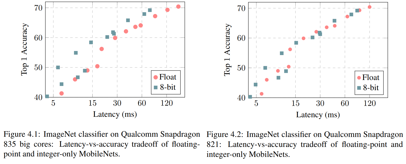 Results from Jacob et al. 2017 compare latency-vs-accuracy tradeoff of the reference floating-point and their 8-bit quantized MobileNets one two types of mobile CPUs. Notice that for the Sanpdragon 821, which is more optimized for floating-point arithmetic, the advantage of 8-bit quantization is less noticeable.