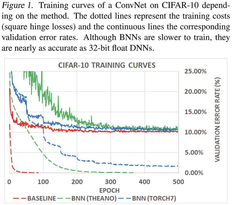 We start in late 2014, when Courbariaux et al. observed that “multipliers are the most space and power-hungry arithmetic operators of the digital implementation of deep neural networks,” and investigated specifically reducing the precision of these operations for efficiency gains, since their cost scales quadratically in relation to bit width, whereas the costs of the other operators in the multiplier-accumulator (MAC) operations (the adder and accumulator) only scale linearly, and are therefore comparably inexpensive. Notably, their study showed that “the use of half precision floating point format has little to no impact on the training of neural networks.” Further, the authors found that “very low precision is sufficient not just for running trained networks but also for training them,” although at this point in time, “very low precision” is referring to 10-bit multiplications, an emblem of how rapidly this field has shifted bits, as we will see.