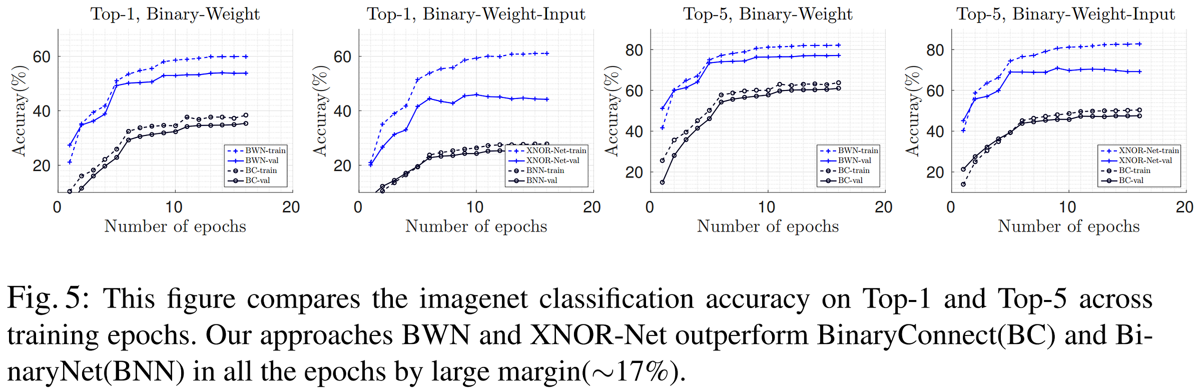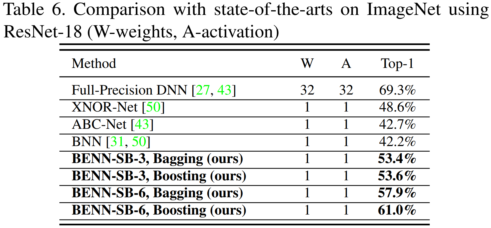 Results from BENN show that BNN ensembles can offer a step change in the performance of binarized networks. Note that they compare to ABC-Net with only 1 bit base for weights and activations, which is a curious choice, since they are comparing against ensembles of 3 or 6 BNNs. Since the complexity of these ensembles without parallelization would be O(3) and O(6), it would be more fair to compare them to similarly complex ABC-Net configurations, which as we can see above range from 49.1% (3bit/1bit) to 54.1% (5bit/1bit), which are still lower, but offer much more informative comparisons. Consider also that INQ produces ternary networks which exceed these results with fewer bits, but the concept of parallelized ensembles of binary networks is extremely compelling.