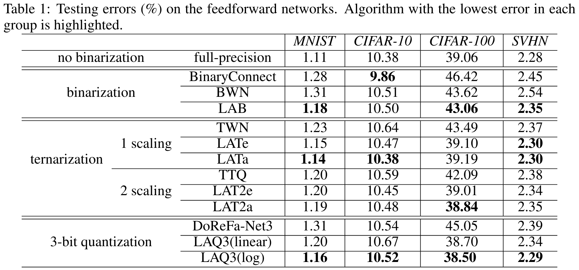 Results from LAQ paper show comparisons with LAB, BinaryConnect, and BWN.