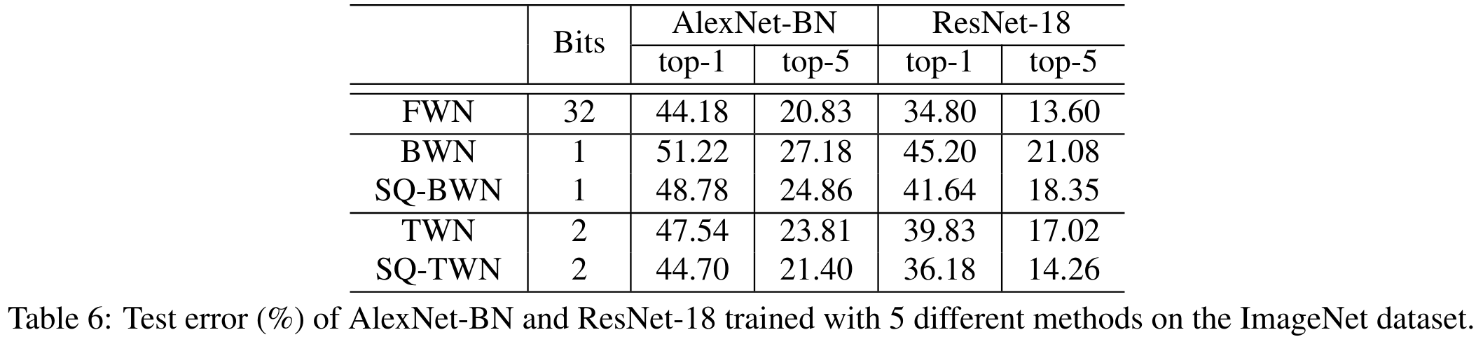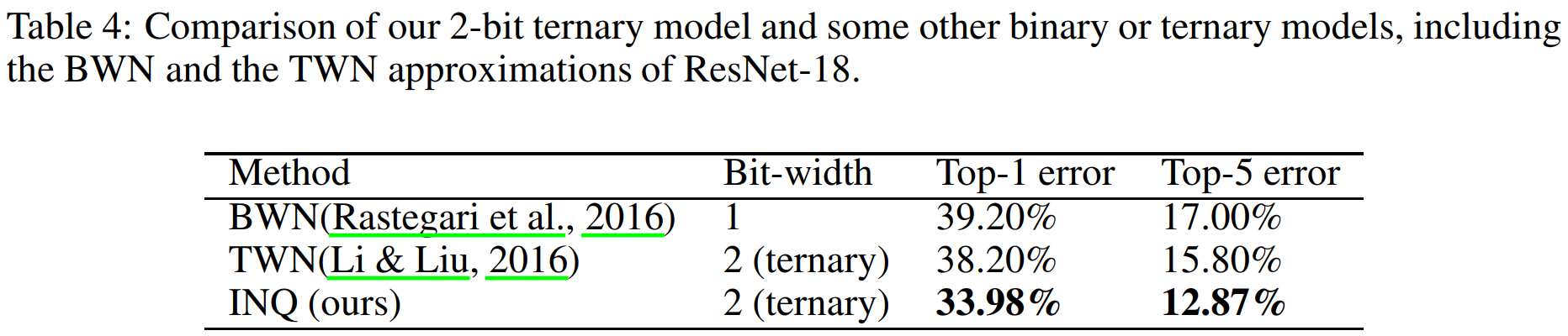 The 2017 Incremental Network Quantization (INQ) paper we saw earlier in the QAT of CNNs section, which surpassed the previous state-of-the-art in model compression set by Deep Compression in 2015, also investigated the viability of their approach in creating ternary networks. In the chart below, we can see that their approach is notably superior to TWN in ResNet-18 trained on the ImageNet classification task, reducing the error by over 4%. Looking above, we can also see that it beats the 36.18% top-1 error rate of the stochastic-quantized TWN (SQ-TWN) by over 2%.
