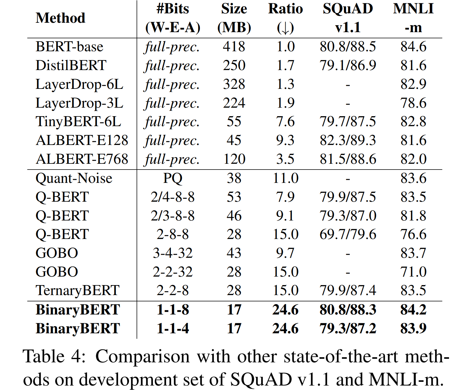 Results from BinaryBERT paper gives comprehensive view of BERT compression techniques and their relative sizes, and shows the impressive representation power maintained by their binarization method. Keep in mind that GOBO is a PTQ method which is a considerable handicap.