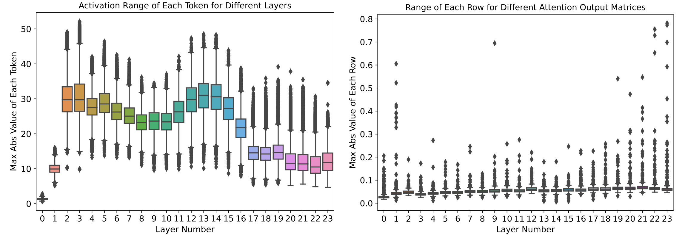 Plots from ZeroQuant paper show the token activations and weight ranges in the attention output matrices across transformer layers in GPT-3 350M.