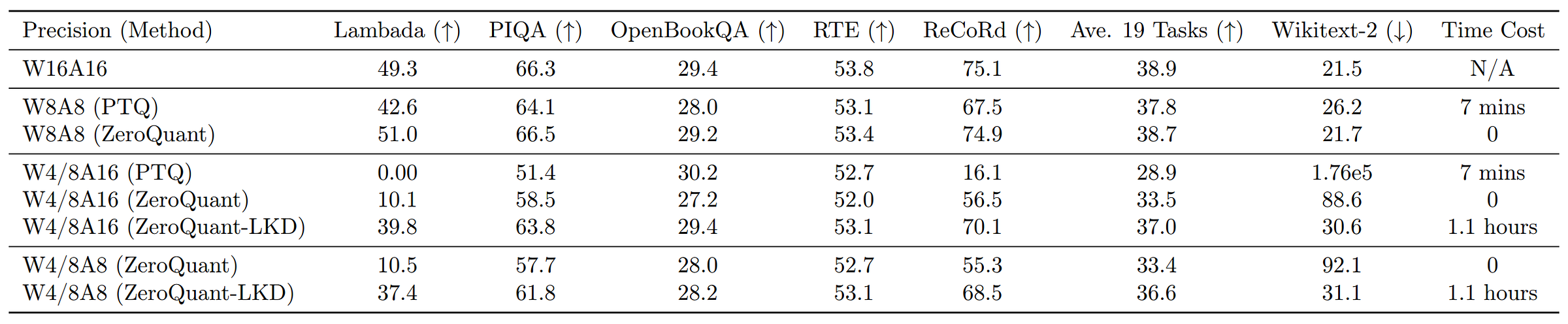 Results from ZeroQuant of GPT-3 350M show baseline performance is matched by the W8A8 configuration. For lower precisions, the LKD step greatly improves performance, but still does not recover baseline accuracy, even in the sub-billion parameter scale model shown here. Note the sharp drop in performance from 8 to 4 bits in the weights in all settings, even with the higher-precision activations, which shows us how difficult low-bit PTQ of LLMs was in mid-2022.