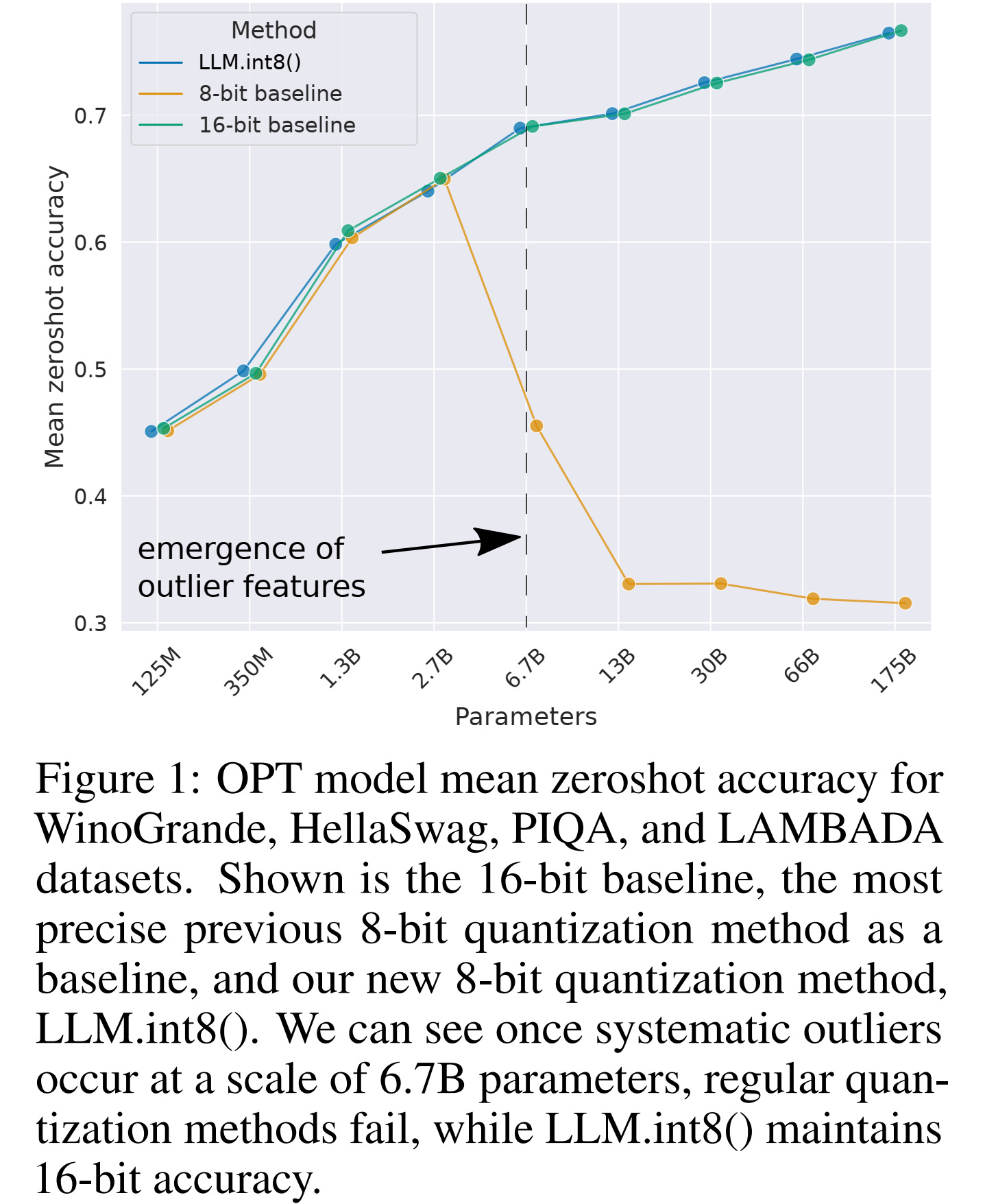 Results from GPTQ (aka OPTQ) shows that their separate handling of systematic outliers preserves accuracy in transformers at ≥6.7B scale.