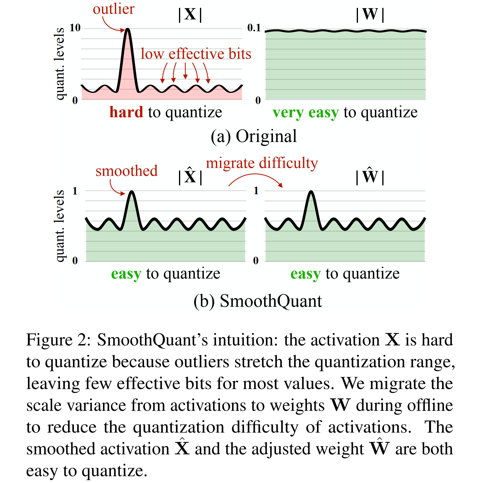 Diagram from SmoothQuant clearly demonstrates the channel-wise regularity of outliers in the activations, which can be absorbed into the weights.
