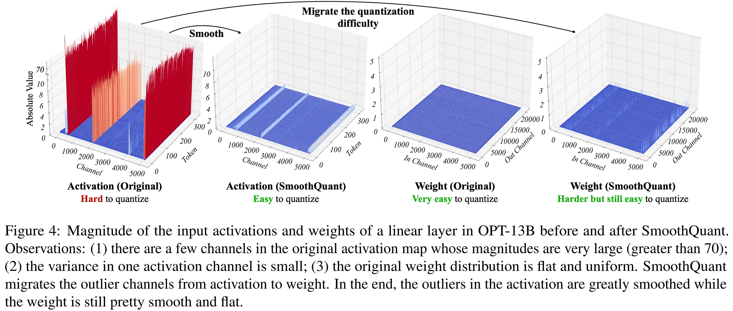 Figure from SmoothQuant demonstrates the offloading of activation outliers into the weights in order to make them more amenable to quantization.