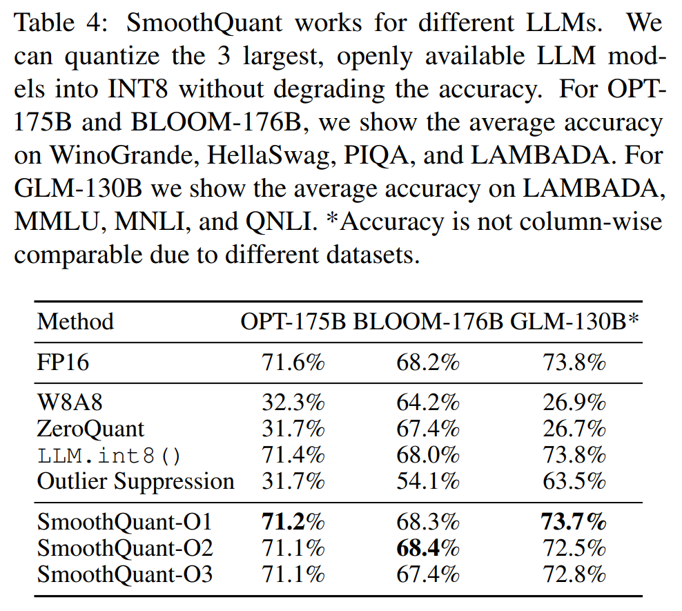 Three configurations of SmoothQuant are tested: O1-O3, which all use tensor-wise weight quantization, but differ in how they quantize the activations. O3 is the least complex, using per-tensor static quantization for the activations, where the scaling factor is calibrated offline. O2 also uses tensor-wise activation quantization, but gets a boost in performance by using dynamic quantization, which calibrates the scaling parameter online using runtime statistics. O1 explores the more complex token-wise dynamic quantization, but achieves only slightly better results than O2. Note that in the SmoothQuant method, LayerNorm and SoftMax layers are still computed in FP16, so it is not integer-only, and the approach does not work below 8-bit. Nevertheless, it marks an important stride in overcoming the particularities of LLMs which made their quantization difficult.