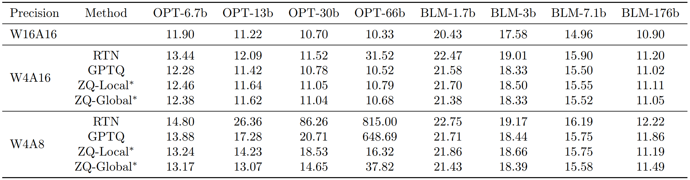 Results from ZeroQuant-V2 show perplexity scores of various PTQ approaches on LLMs. Note that the real divergence between ZeroQuant-V2 and GPTQ is seen in the W4A8 quantization of OPT-style models, which we now know contain sensitive outliers thanks to the SmoothQuant paper, and so it is likely that the improved performance of ZeroQuant-V2 over GPTQ is the ability for the block-wise granularity to better preserve the outliers occurring in the activation channels.