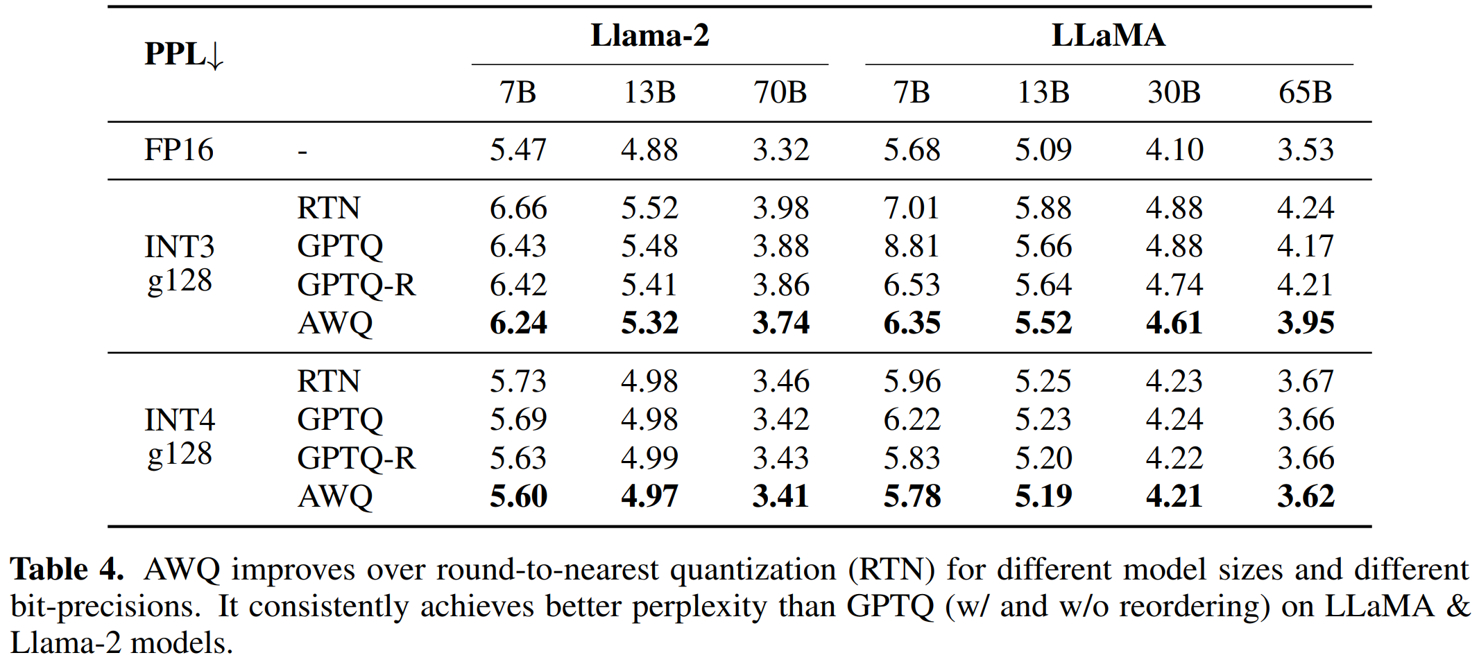 Results from AWQ showing improved perplexity scores over RTN (LLM.int8) and GPTQ.