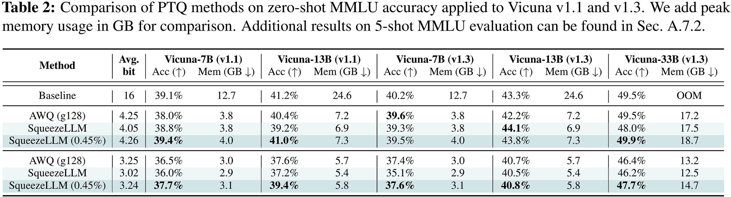 Results from SqueezeLLM show roughly equivalent instruction-tuning results to AWQ under given bit constraints.