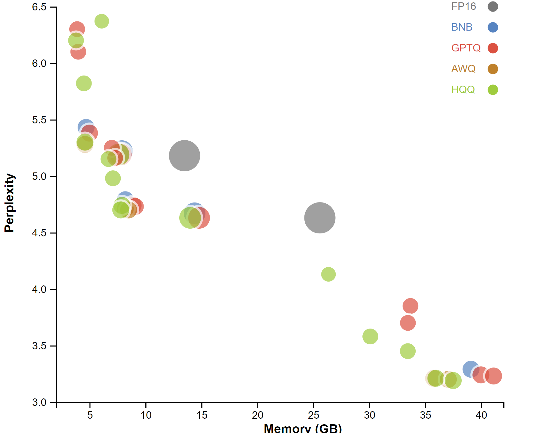 Chart from HQQ shows that it provides lower or equal perplexity at given memory budgets to other state-of-the-art approaches, while being much faster. BNB refers to bitsandbytes, aka the data-free LLM.int8() method.