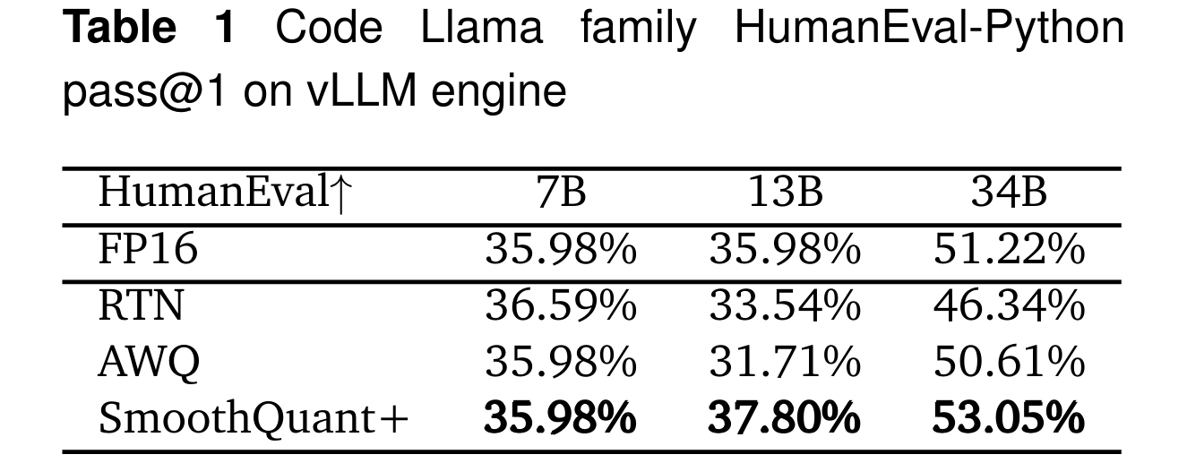 In December of 2023, SmoothQuant+ set a new state-of-the-art in 4-bit uniform PTQ. The authors address the limitations of AWQ, which has a search space that scales with the number of layers, and does not take the problem of error accumulation “into account during the searching process, which makes the search speed slow and the model accuracy degraded.” Further, they assert that the weight quantization loss is amplified by the activation outliers, and smoothing their values with weight adjustments can therefore greatly reduce overall quantization error. The authors provide custom W4A16 kernels for the popular vLLM inference engine, and design the SmoothQuant+ implementation to work without requiring a preprocessing step from the user, allowing them to load FP16 models directly from the Hugging Face hub, with the quantization process applied automatically as the model is moved onto the GPU. Unfortunately, as of the time of this writing, the SmoothQuant+ algorithm code has yet to land on the public GitHub page, and the integration into vLLM is not yet online.