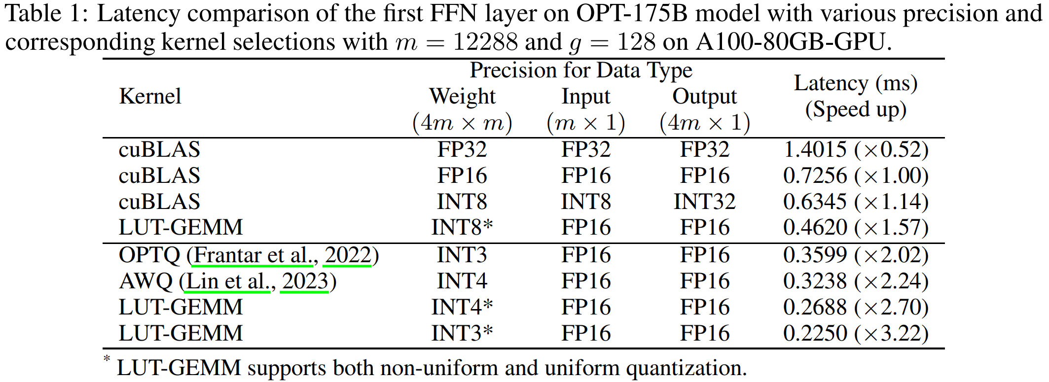In April 2024, Park et al. published the latest version of their LUT-GEMM paper. In this work, the authors point out that weight-only quantization typically enables higher compression rates at a given level of accuracy compared with quantizing both weights and activations, since memory traffic is highly dominated by the weights, and the activations are much more sensitive to quantization. However, as we’ve discussed, this comes at the cost of losing integer-only benefits and requires dequantizing the weights before multiplication. To address this, LUT-GEMM is a kernel designed to enable the matrix multiplication directly between quantized weights and unquantized FP16 activations without requiring a dequantization step.