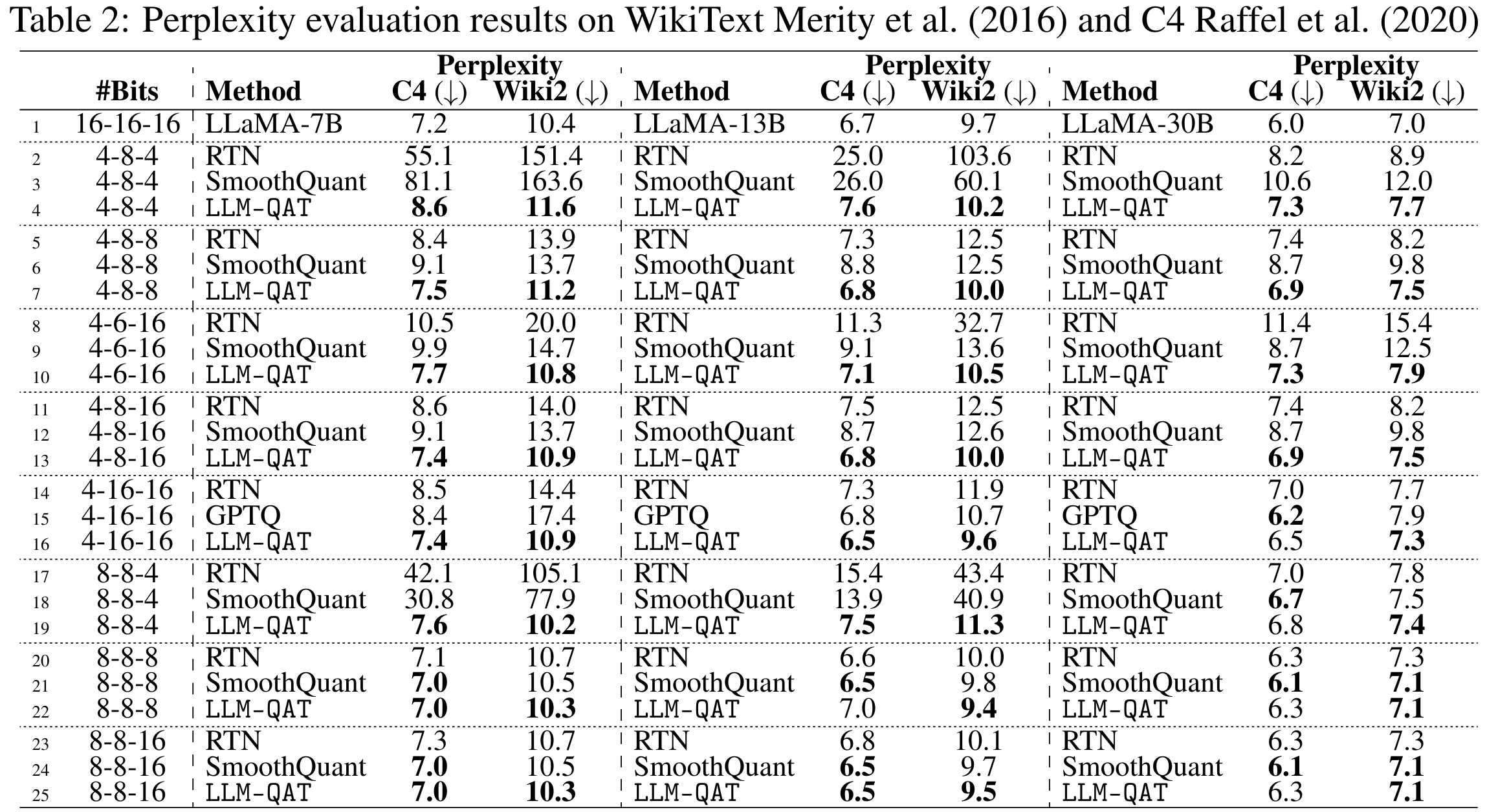 Results from LLM-QAT show the dominance of their approach in low-bit settings. Bit values shown in W-A-KV order. Perplexity is considered a stringent metric.