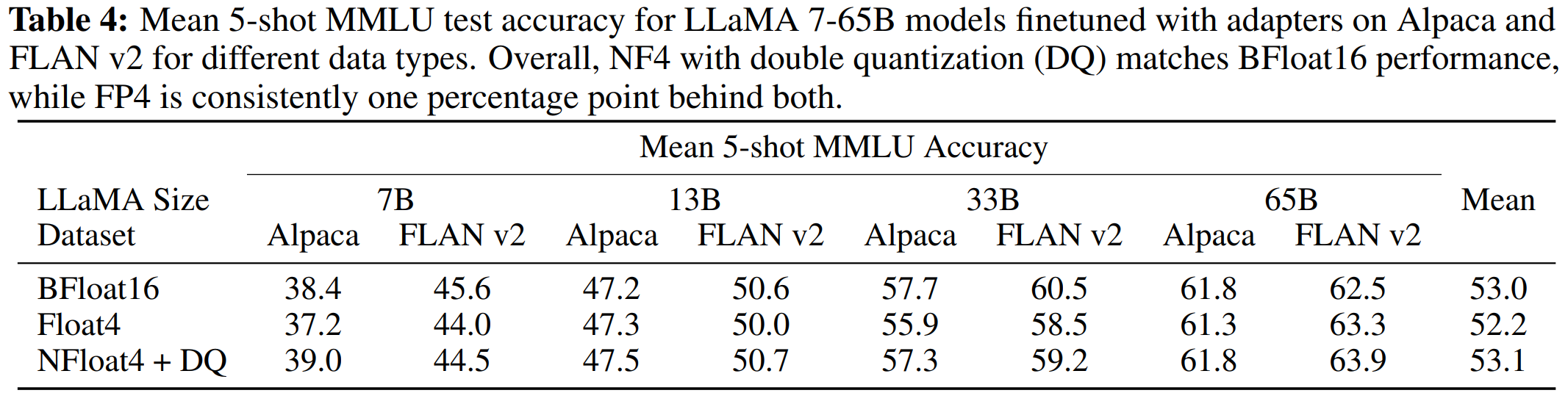 Table from QLoRA paper demonstrates that the performance lost due to quantization can be fully recovered by applying QLoRA fine-tuning on 4-bit quantized models.