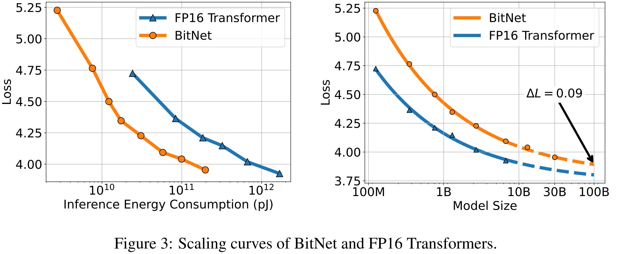 Charts showing that BitNet performance scales similarly to full-precision transformer. Note that the left chart demonstrates that equal performance can be achieved with an order of magnitude less energy consumption.