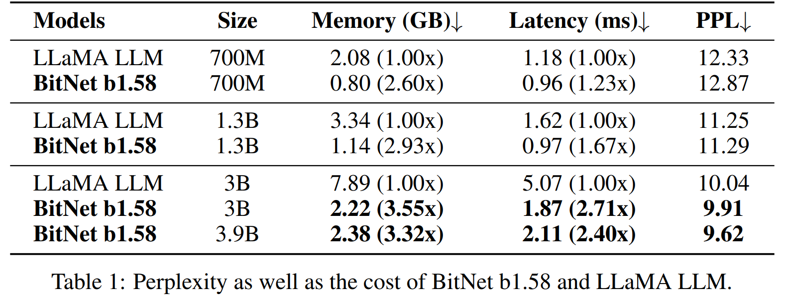 Following up in 2024, the BitNet authors published BitNet b1.58 which expanded their work into the use of ternary {-1, 0, 1} weights, adding the zero value into the previous 1-bit BitNet system by tuning a γ threshold parameter that clamps small values to zero. As we learned with ternary CNNs, adding in the zero value in the weights causes no increase in operational complexity, since multiplications can still be replaced by addition/subtraction, but it markedly improves performance by enabling the weights to perform “feature filtering,” at the expense of doubling the number of bits per weight from 1 to 2. In either case, since the weights are smaller, the transfer from DRAM to SRAM is easier, and memory traffic is reduced. The authors use symmetrical quantization for easier kernel optimization, quantize activations to 8-bit, and quantize the KV cache to 4-bit. Using this approach, the authors train ternary networks from scratch which match baseline FP16 performance in both perplexity and task performance.