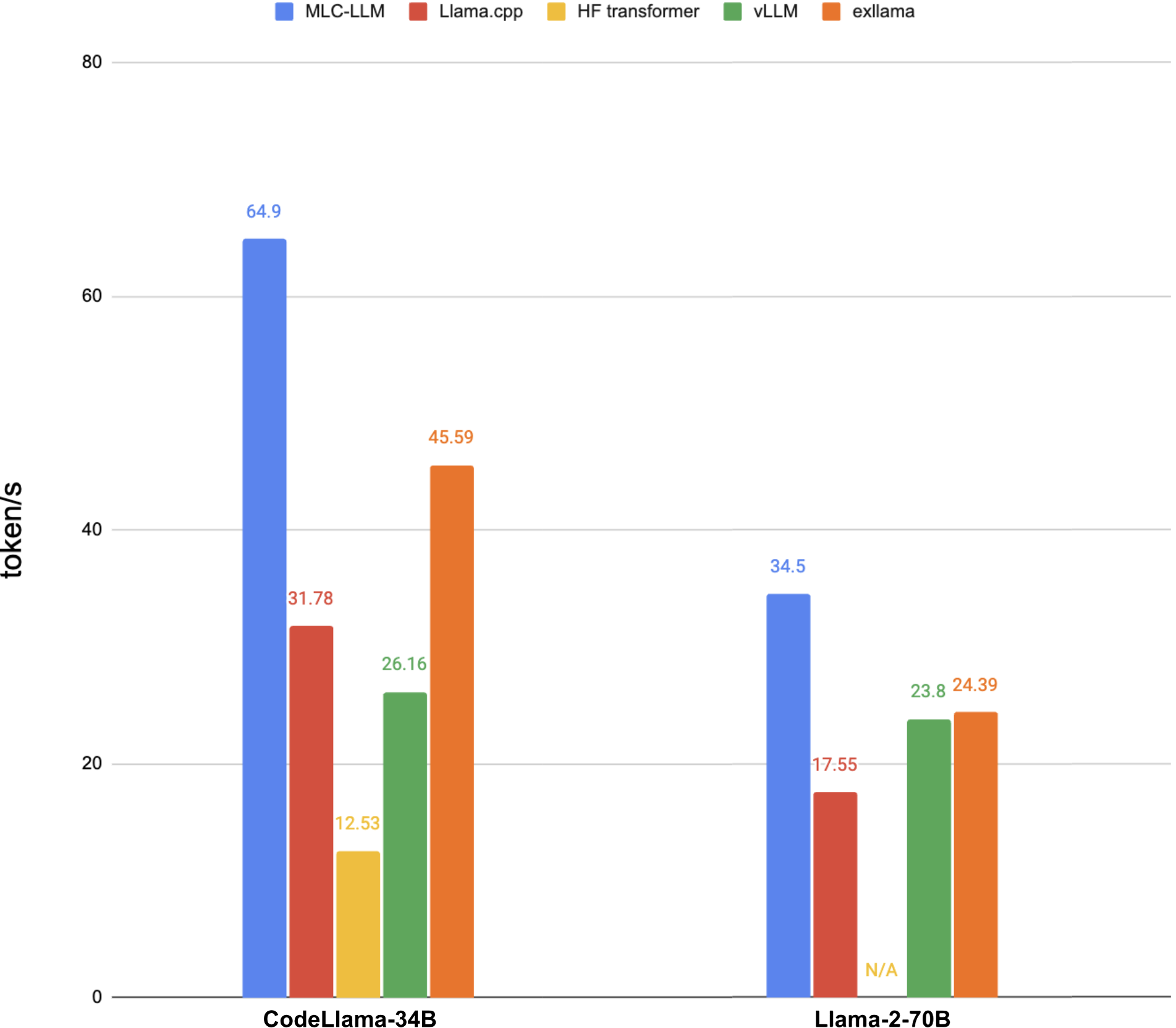 Results from MLC-LLM shows throughput of 4-bit CodeLlama-34B and Llama2–70B on two NVIDIA RTX 4090. We can see that any specialized inference engine offers substantial gains over using HF Transformers, but that for these NVIDIA cards, MLC-LLM outperforms the others consistently.