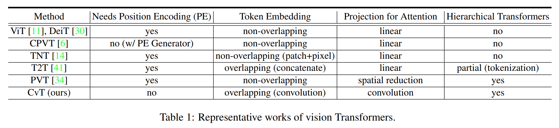 This table from the CvT paper is a helpful summary of the work in vision transformers up to their publication. Interestingly, a look at the PVT code reveals that “spatial reduction” is just a euphemism for 2D convolution.