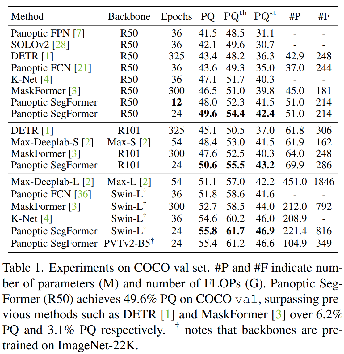 Chart from Panoptic Segformer paper. Note the two best performing models at the bottom built with Swin-L and PVTv2 backbones, where the latter has comparable performance with half the parameters.